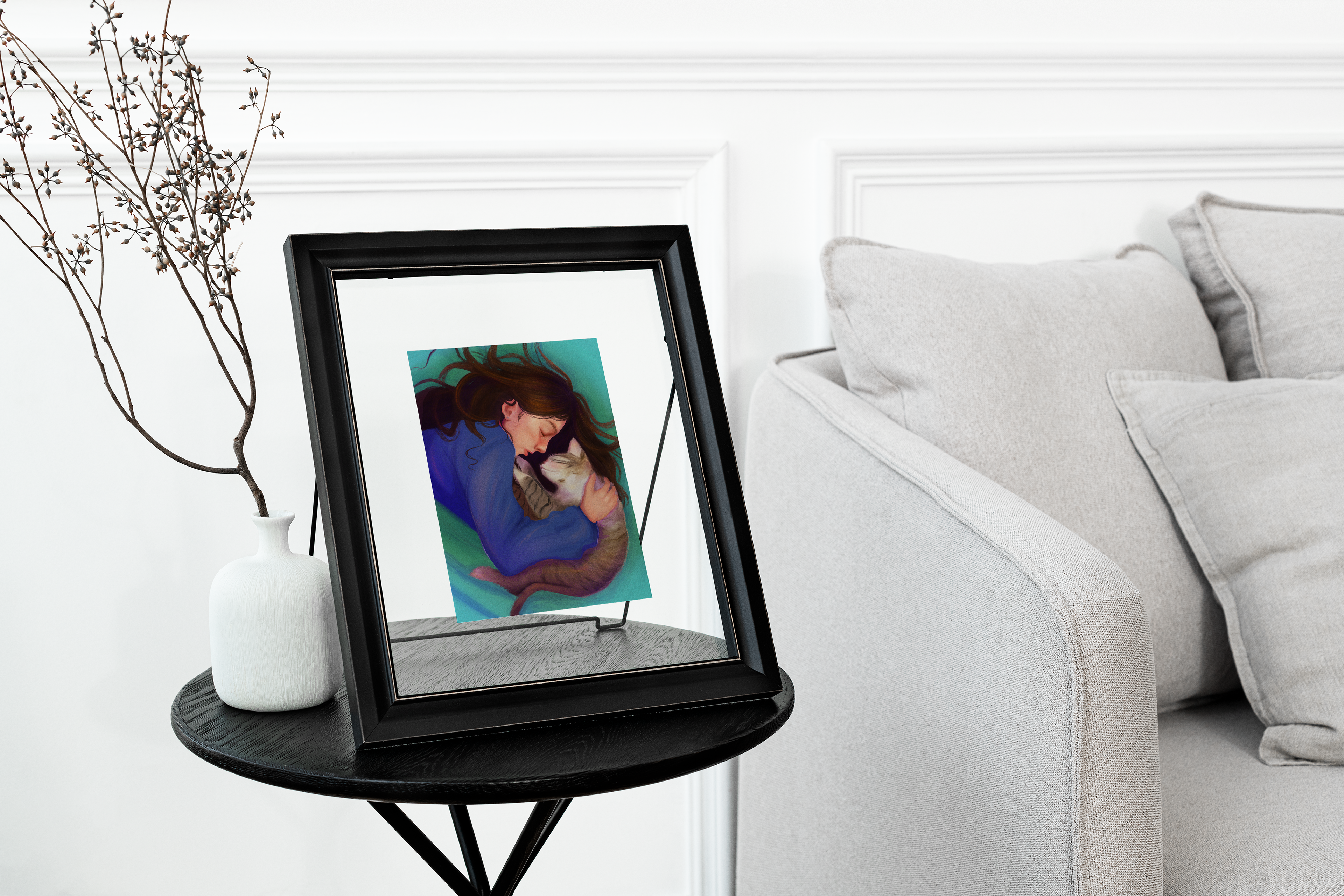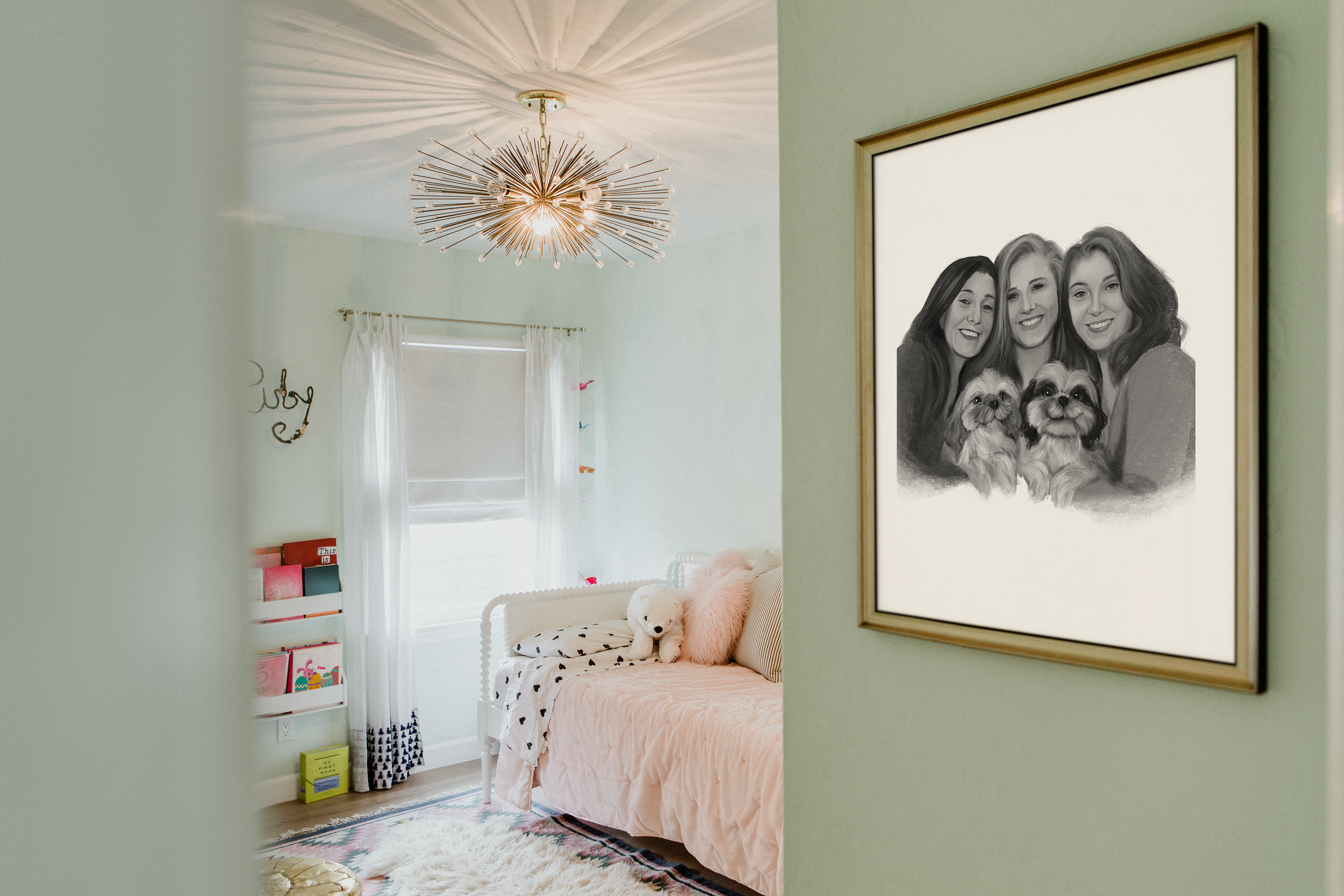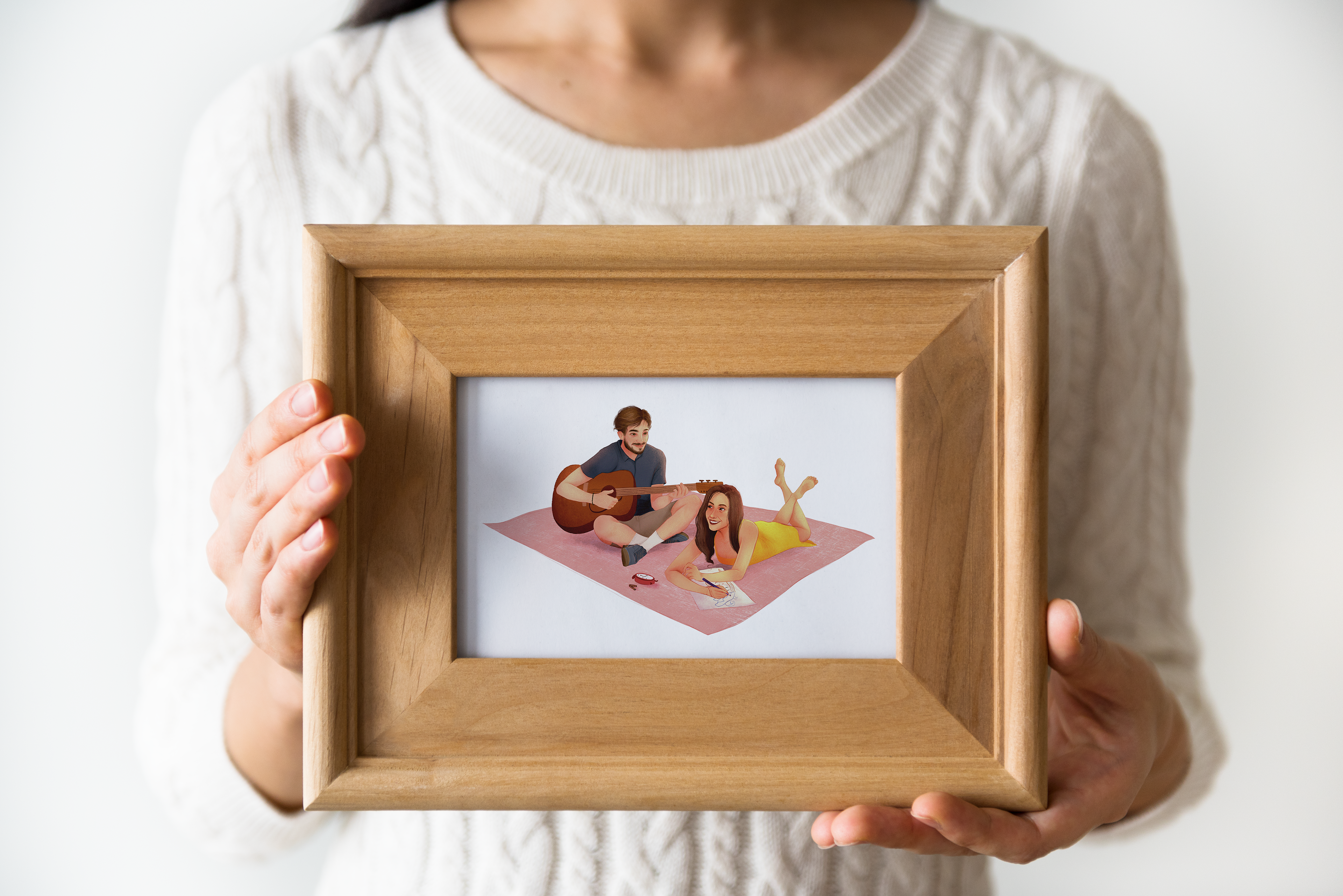 Retratos de família e para presente. Feitos digitalmente no aplicativo Procreate, impressos em folhas A2, A3 e A4, e colocados em molduras.
